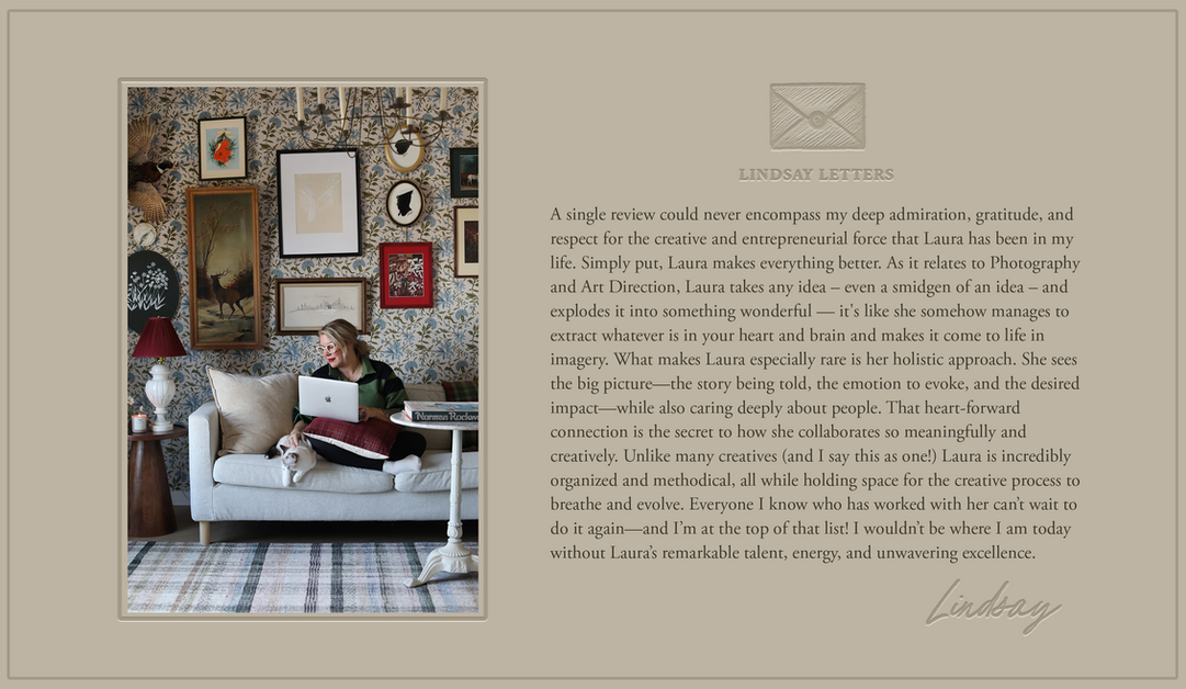 Rooted in her faith, Laura loves to thoughtfully curate and capture the beauty of home. As a freelance photographer and stylist, she partners with interior designers and homeowners to create spaces that feel natural, warm, and inviting. She also collaborates with brands to art direct products designed for the home. With her diverse creative background, Laura offers personalized support tailored to each client’s needs. Whether she’s behind the camera, styling a space, or guiding the overall creative direction, she is passionate about making things both beautiful and meaningful for those she serves.
